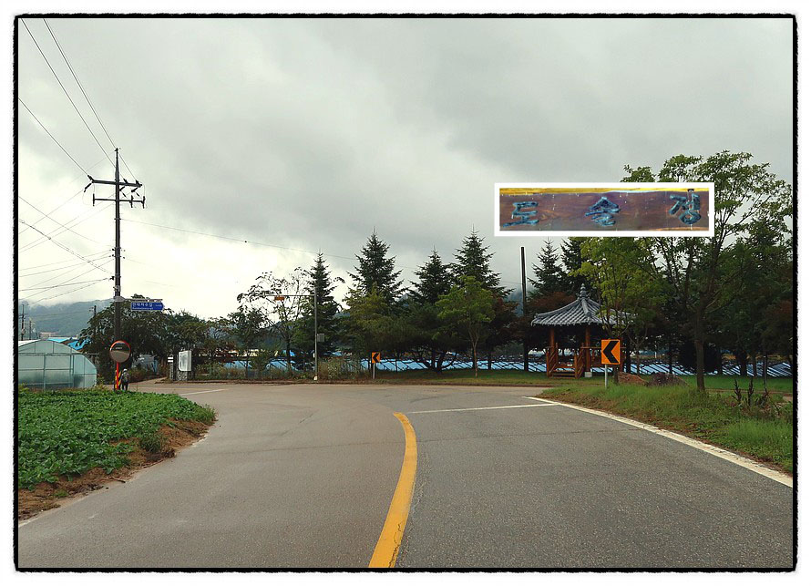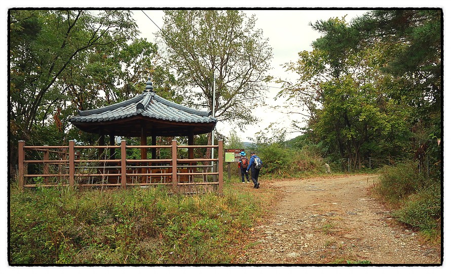 ['도솔정'] 10:37 "도솔정"이라는 정자 쉼터를 만납니다. <도솔산>이 보일려나 뒤돌아 보았으나 구름 속에 숨어 있어 볼수 없었습니다. 미륵보살의 하늘나라 궁전이라는 <도솔천> 얘기는 지난 답사기에서 언급했으니 생략하고