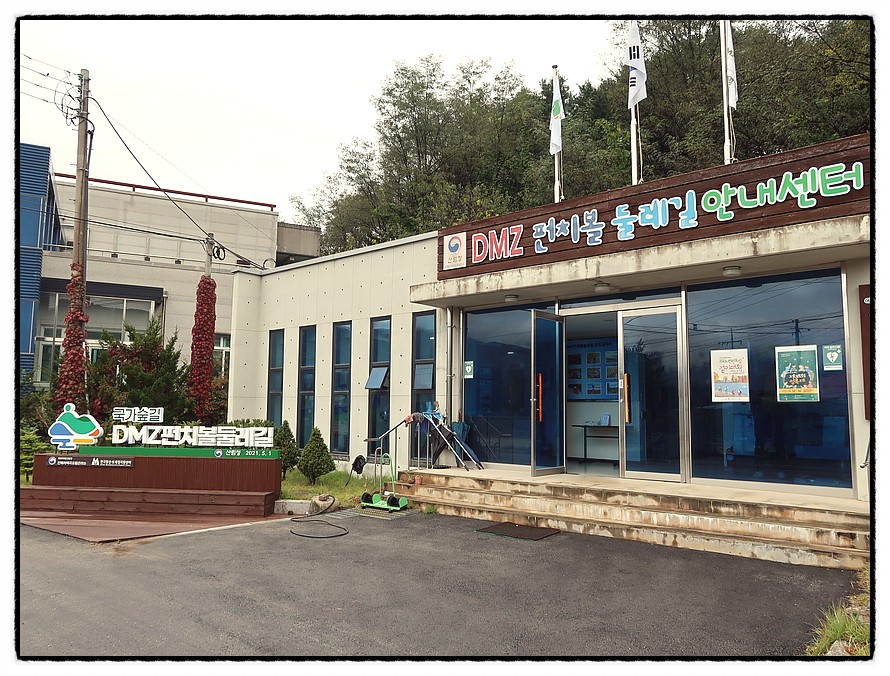 ['펀치볼둘레길 안내소'] 11:33 이어서 "DMZ펀치볼둘레길 안내소"를 만납니다. <펀치볼둘레길>은 신청해야만 갈수 있고, 적정 인원이 되면 해설사가 해설과 함께 안내한다고 합니다.