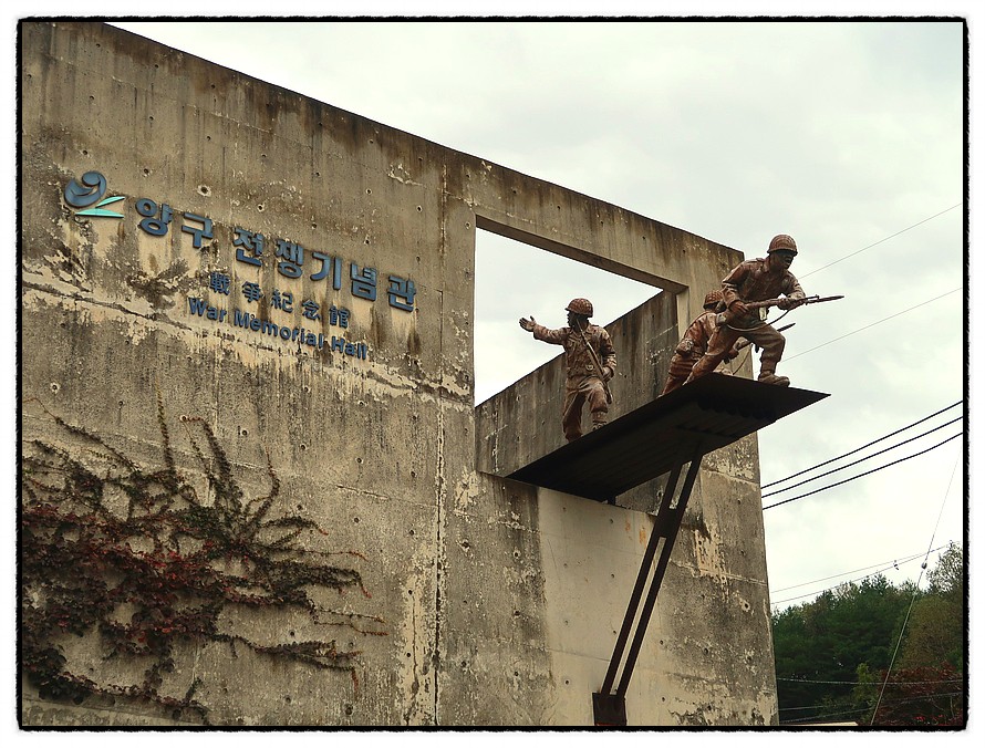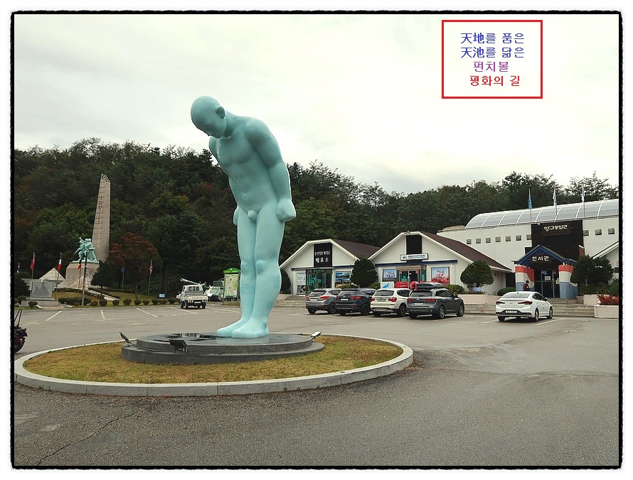 ['양구통일관' 앞] "그리팅맨 greeting man".... 해석하자면 "인사하는 사람"이 되겠군요. 양구가 고향이라는 <유영호 조각가>의 작품으로 전세계 사람들과 겸손, 화해, 평화를 공유하고자하는 작가의 마음을 담았다고 하는 작품이라는데....옷은 왜 벗겼나?...그래야 겸손, 화해, 평화가 오는가?ㅎ 여하튼 전세계 10개국에 전시하고 있는 제법 유명한 작품이라고 합니다. <통일전시관> 옆에는 편의점과 쉼터가 있는데 함께 하신 분이 컵라면을 사주시어 잘 먹었습니다. 감사
