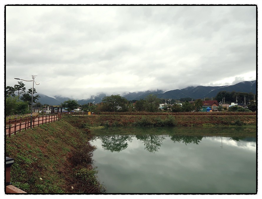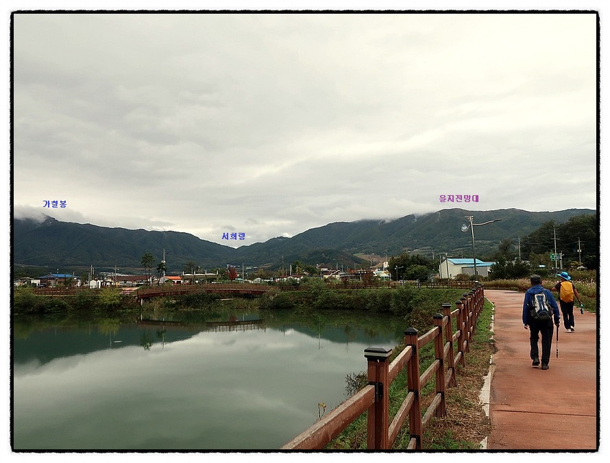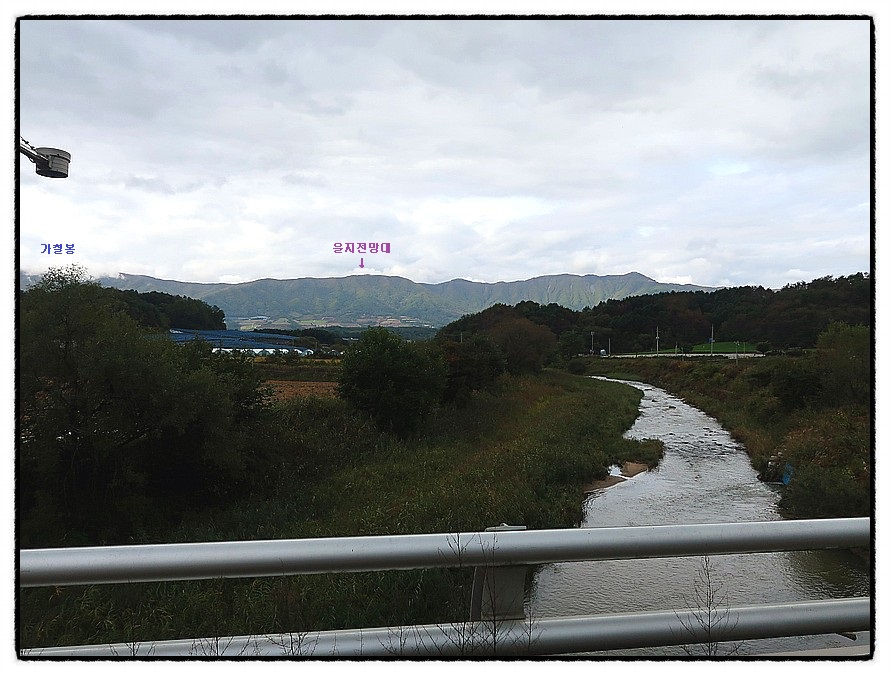 ['성황지'에서 조망] "성황지 城隍池" 이 연못은 "비점오염저감시설 <침사지>"랍니다. 즉 친환경 수질 개선을 위한 침사지라는거겠죠. 오늘 불행하게도 구름이 산 정상을 뒤덮고 있어 그 유명한 "가칠봉 加七峰 1,242.2m"을 전체적으로 조망 할수 없군요. 좌측 <가칠봉>이라고 표기한 곳 앞에 보이는 봉우리가 <작은 가칠봉>이고, 뒤에 구름 속에 있는 놈이 <큰 가칠봉>입니다. <가칠봉>이라는 이름의 산은 전국에 여럿 있죠. <금강산>의 봉우리에 우리 일곱 봉우리도 낑겨 달라고 <加七峰>이라 한다는데 <해안면>의 진산이고 "서희령 西希嶺"은 <도솔지맥>이 지나는 고개로서 <금강산>으로 가는 고개 중에 하나랍니다. <서희령> 약간 우측에 "제4 땅굴"이 있고... 요즘 공사로 휴관 중에 있다는 "을지전망대"가 구름 속에 잠겨 있습니다. <을지전망대>가 있는 저 산줄기 바로 뒤가 <휴전선>이어서 <남방한계선>이 거의 없는 유일한 곳이지요.