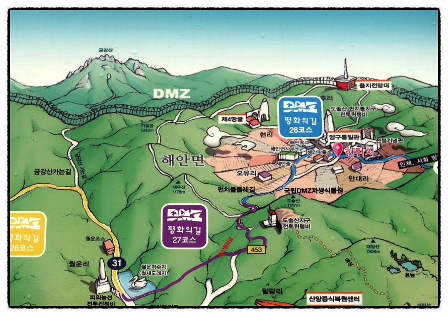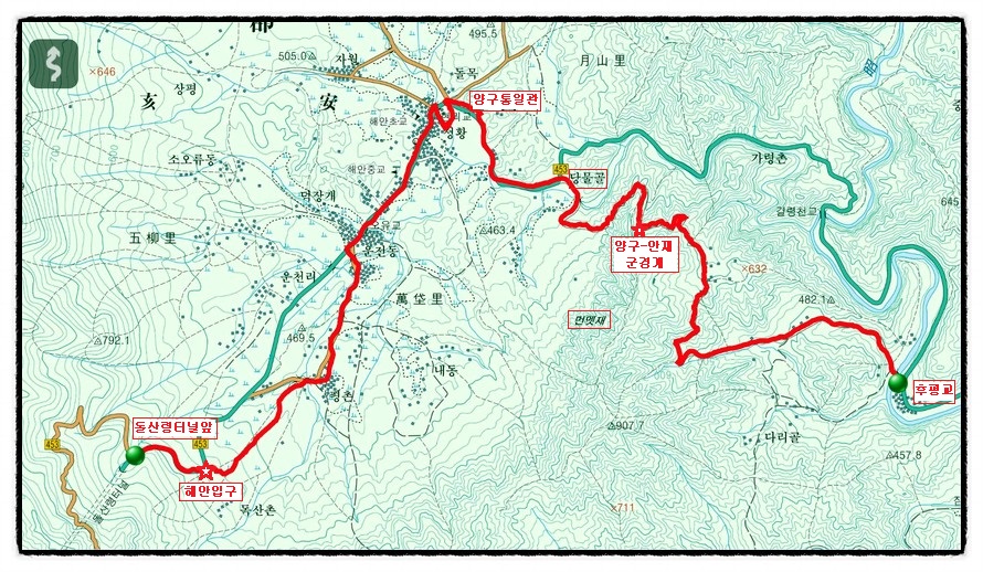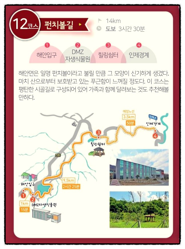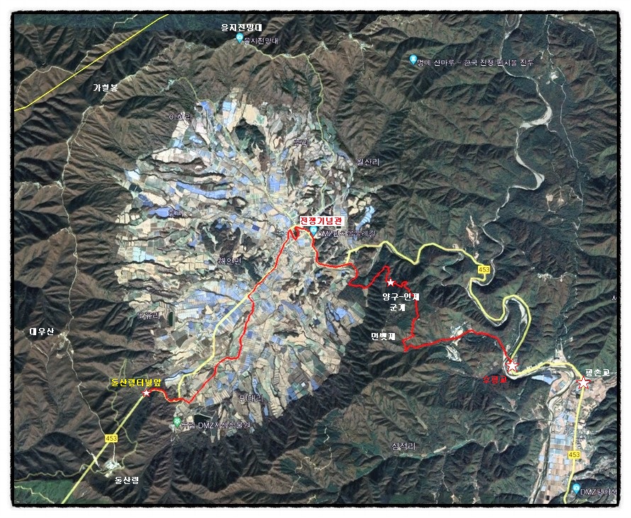 『강원 평화누리길』 『제12코스 펀치볼길』 天地를 품은 天池를 닮은 "펀치볼"을 가다 돌산령터널-해안입구-만대벌판길-도솔정-만대3교-해안면사무소-성황지-양구통일관- 전쟁기념관-물골교-숲밥쉼터(양구-인제군계)-13코스 서화길출발지-후평교['11코스 실트랙']
