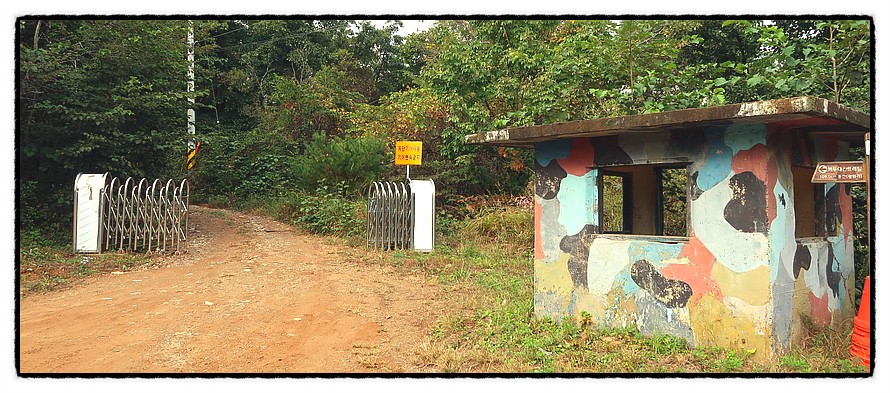 ['대암산군부대 입구'] 우측으로는 <대암산 군부대>로 가는 길인데 자바라 출입문과 초소가 있습니다.