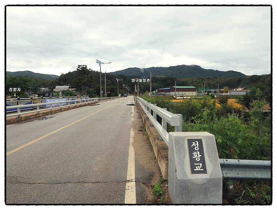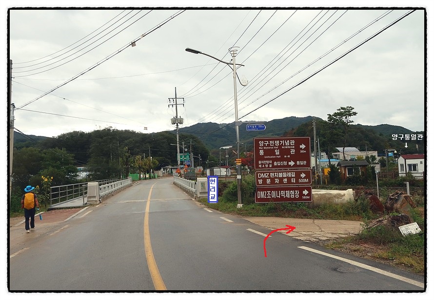 ['현리교' 앞] 11:21 <현리교>를 만나는데 안내판이 우측으로 가라고 합니다. 예전에 승용차를 타고 갈땐 직진하면 바로 <양구통일관>이었던 걸로 기억나는데.... 우측에 있는 <성황지>를 구경하고 가라는듯 해서 우측으로 200m쯤 진행하면