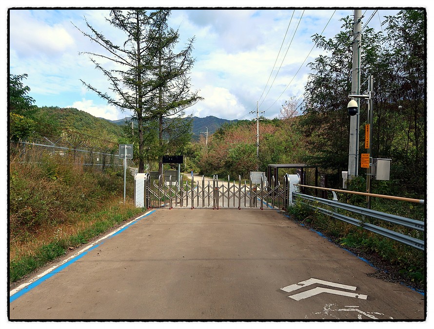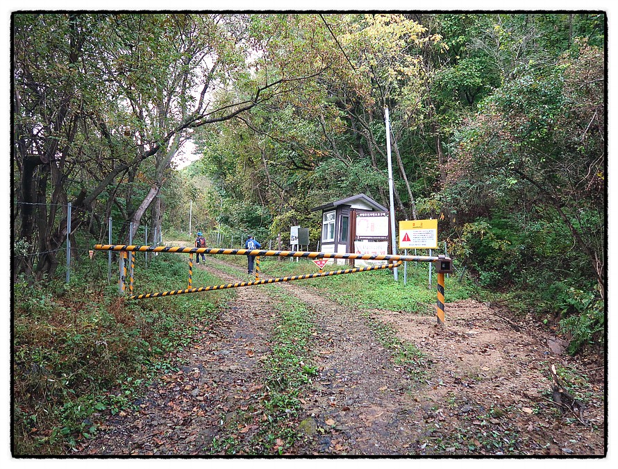 ['자바라 출입문'] 1:37 ★사진을 클릭하면 확대 됨★ <자바라 출입문>이 있는 곳에 도착하는데 <진부령>에서 북쪽 <향로봉>으로 향하는 <백두대간>이 조망됩니다. 사진을 클릭해 보세요. 대간 종주 하신 분들은 감회가 남다를 것입니다.