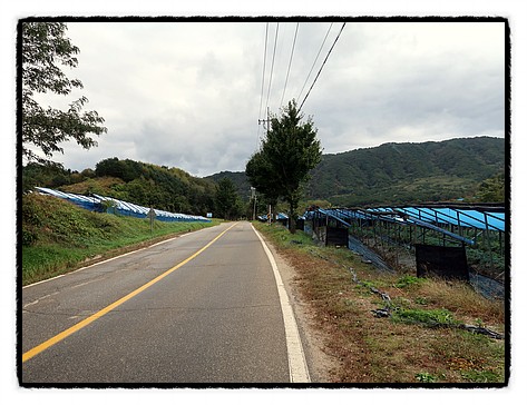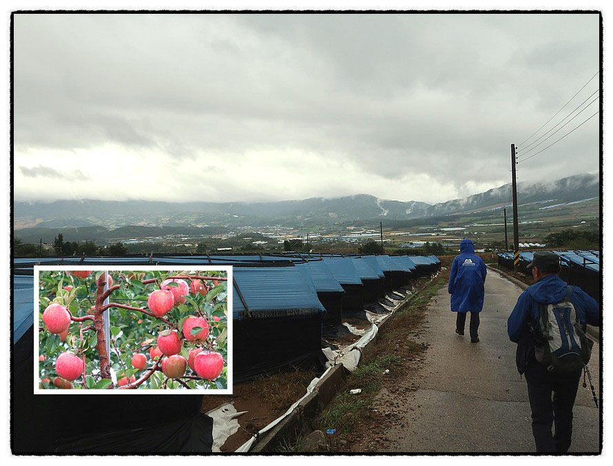 [인삼밭과 사과 과수원] <강화도>나 <개성>의 특산물이던 "인삼"이 요즘엔 "양구 펀치볼 인삼"으로 바꼈다고 자랑하는 인삼밭이 새로운 모양의 차양막을 두르고 태양광 발전소처럼 마냥 펼쳐집니다. 그리고 기후 온난화로 이젠 <양구 펀치볼 사과>가 매우 인기 있다죠? 사과 재배지가 계속 북상해서... 대구→문경→충주→평택 안성→춘천→양구 펀치볼.... 좀 더 있으면 <백두산 사과>도 맛 볼수 있을려나 ~~ㅎㅎ 낮과 밤의 일교차가 가장 큰 곳이라 과일의 당도가 최고수준이랍니다. 그래서인지 값도 무지 비싸고