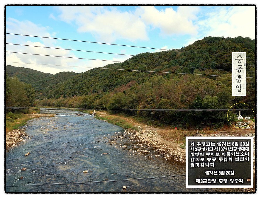 ['인북천'과 '승공통일비'] "인북천 麟北川" <백두대간 금강산군>에 속하는 "매자봉"이라는 곳에서 <도솔지맥>이 분기되어 <백두대간>과 <도솔지맥> 사이 계곡에 흐르는 개천이 바로 이 <인북천>이며 <소양강>으로 흘러 갑니다. 그러니까 이 개천은 <금강산>에서 온다고 할수 있습니다. <인북천>은 <인제의 북쪽>에 있는 개천이라고 붙여진 이름이며 <소양강>의 '제1지류'가 되겠습니다. 우측에 보이는 비석 같은 것은 이름만 들어도 금방 알아볼 "정승화 육군참모총장"이 당시 <제3군단장>이었을 때 이 다리 "후평교"를 준공하고 기념으로 "승공통일비"를 세웠다고 하네요. <전두환>의 <12.12 군사쿠데타> 때 <육군참모총장>인 <정승화 대장>이 <전두환 소장>에게 체포되었지요. 그가 제3군단장 중장 시절에 이 <후평교>가 만들어 졌다는 것을 알수 있습니다.