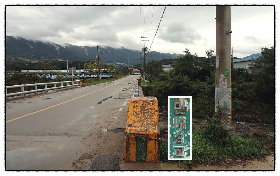 ['만대3교'] 10:54 <만대리 萬垈里>를 17분 정도 통과하면 <만대3교>라는 다리를 하나 건너 갑니다. 이 분지엔 개천도 많더군요. 곳곳에 다리가 있으니... <펀치볼>이라는 분지에 떨어지는 빗물은 모두 잠시후 만나게 될 <물골교>를 통과해서 <인북천>에 합류하여 <소양강>으로 흘러 가고, 다시 <북한강>에 흡수되어 <서해>로 갑니다. 그러니까 이곳 <해안면>도 <한강 발원지 중 한곳>이 되겠습니다.