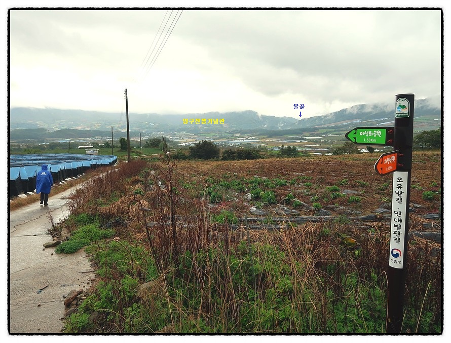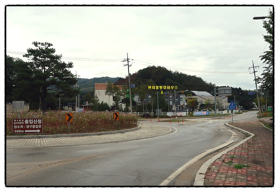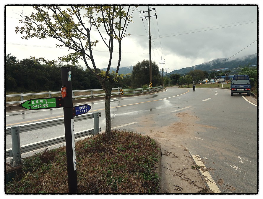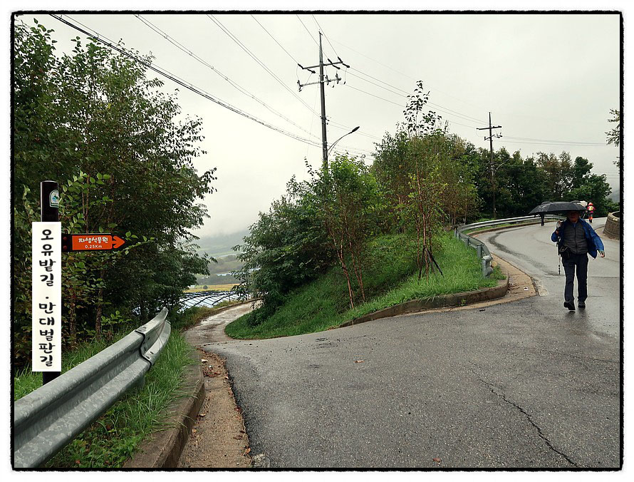 ['오유밭길-만대벌판길' 입구] 10:15 <해안입구 삼거리>에서 우측 <자생식물원> 방향으로 몇십m만 가면 다시 이곳 갈림길을 만나는데 "DMZ자생식물원"의 <방문자센타>는 지난번에 버스로 다녀 왔기에 생략하고 <오유밭길-만대벌판길>을 관통하여 <해안면 중심가>로 들어 가 이곳 사람들의 생활상을 느껴 보고 특히 <해안 펀치볼>의 대표 관광지라는 "양구통일관-전쟁기념관"을 탐방하려 합니다. 그래서 <평화누리길 12코스> 정규 코스에서 약간 벗어나 진행하는 것입니다.