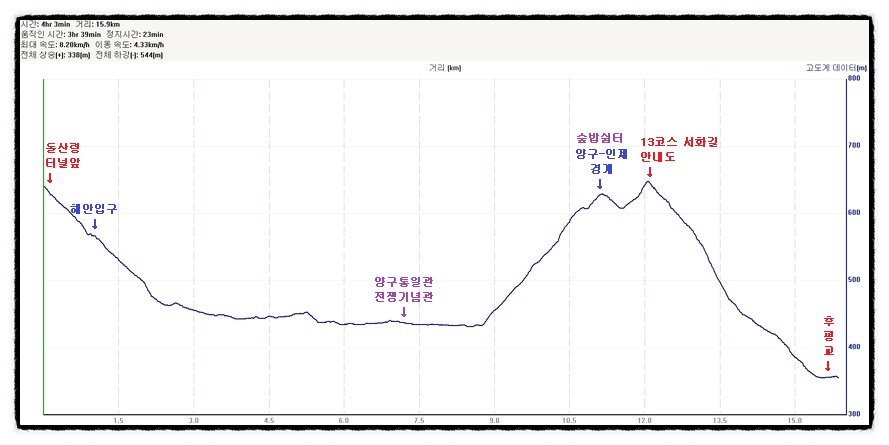 [고도표] 오늘 저의 GPS에서 측정된 거리는 15.9km였으며 4시간이 걸렸습니다. 가을이 오는걸 받아드리지 않으려고 했습니다 뜨거운 여름 햇살만 생각하면서 이 가을 보내고 싶었습니다 하늘이 높아지고 들판이 노랗게 변하는걸 보면서도 내곁에 가을을 두고싶지 않았습니다 가을 속에 파뭍혀 외롭지 않으려고.... 그리고 겨울로 가고 싶지 않아서....