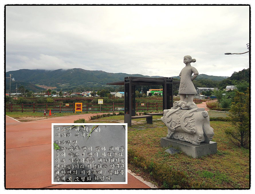 ['성황지'] 11:26 입구에는 <우제권>이라는 분이 만든 "해안 亥安"이라는 조각작품이 나그네를 맞이합니다. <돼지> 위에 우뚝 서 있는 <소녀>가 "해안 亥安"이라는 의미를 함축하고 있다고... 제가 풀어서 설명하는 것보다 <양구군>이 공식적으로 설명하는 "해안 亥安" 지명의 유래"를 안내합니다. <양구군 공식 동영상>인 다음 동영상을 꼭 보고 가세요. 잼있어요 ㅎ