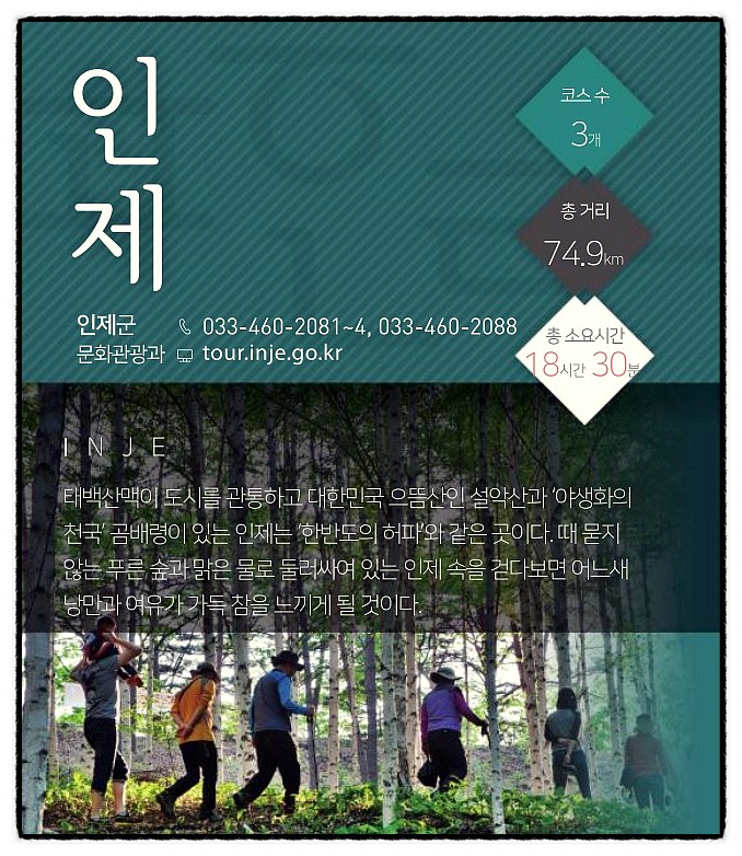 [안내도] "평화누리길 인제구간"이 공식적으로 시작됩니다. 3개 코스로 이루어진 <인제구간>은 총74.9km라고 합니다.