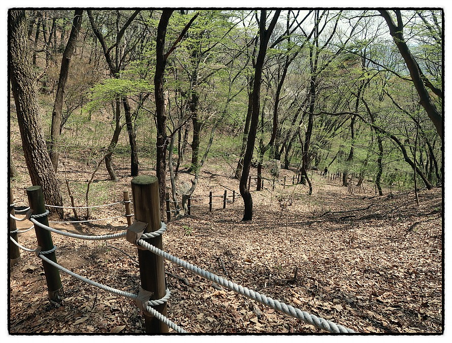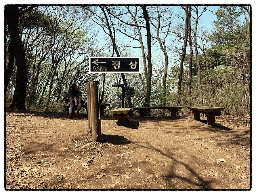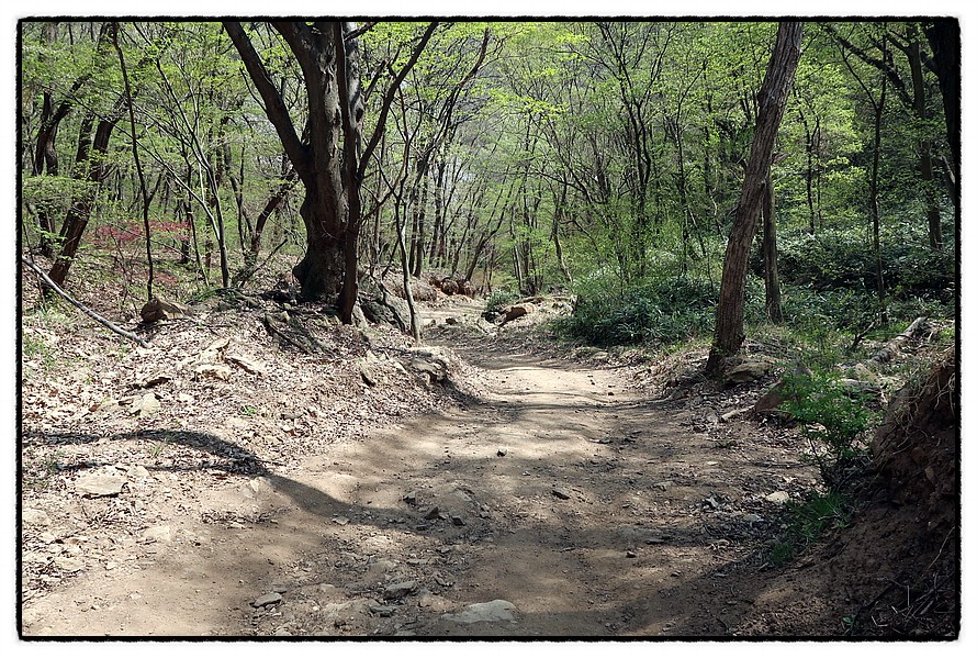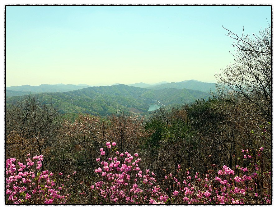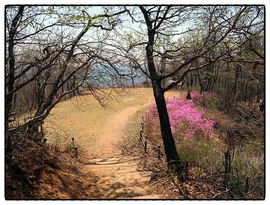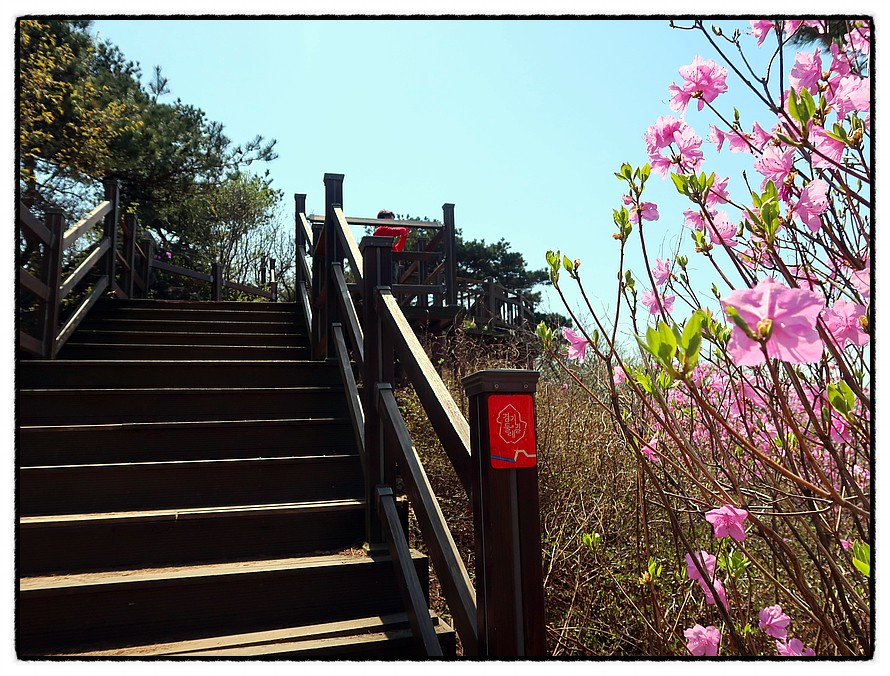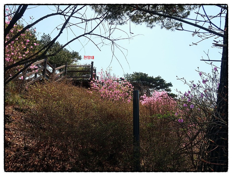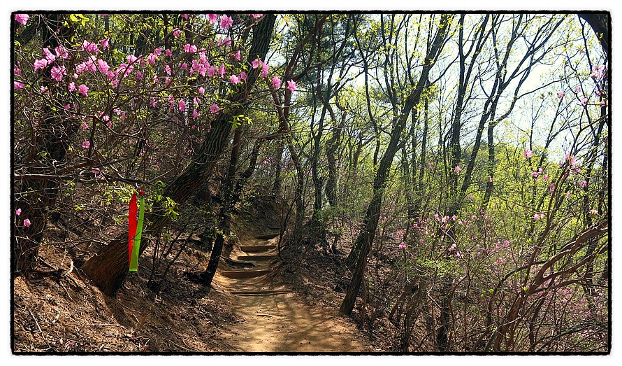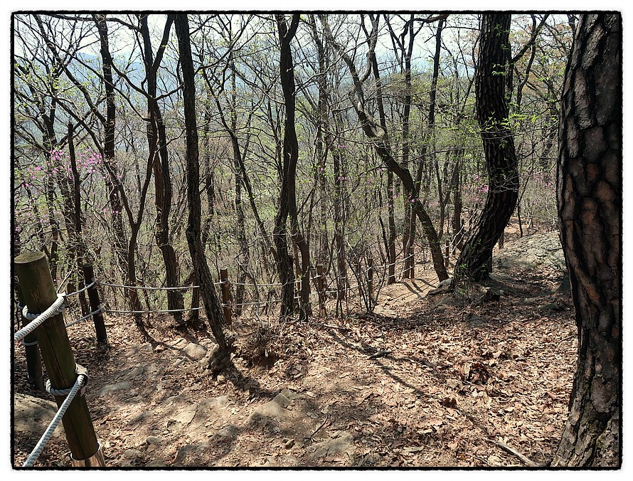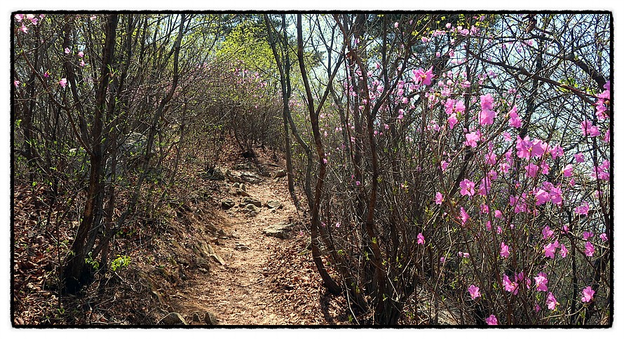[오름길] 능선삼거리 쉼터부터는 길은 좁아지며 경사가 조금 있습니다. 15분 정도 올라 갑니다. 그리고 고도가 높아지니 이곳은 이제서야 진달래가 활짝피기 시작하는군요.