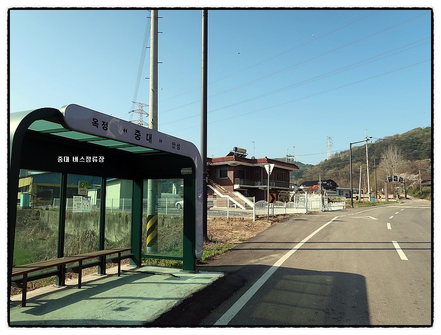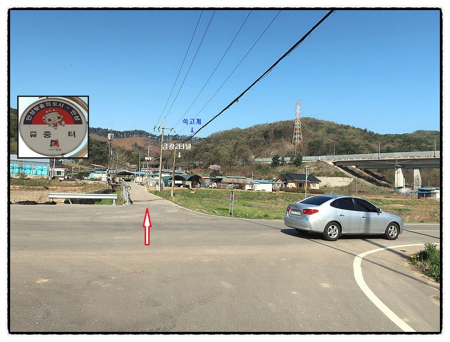 ['중터 버스정류장'] 9:15 조금전 삼거리에서 직진해 오는 차도를 만나는데 <중터버스정류장>이 있더군요. 여기서 앞에 보이는 <쑥고개>를 넘어 가야 하는데, 먼저 <평택-제천 고속도로 금광2터널>로 가면...
