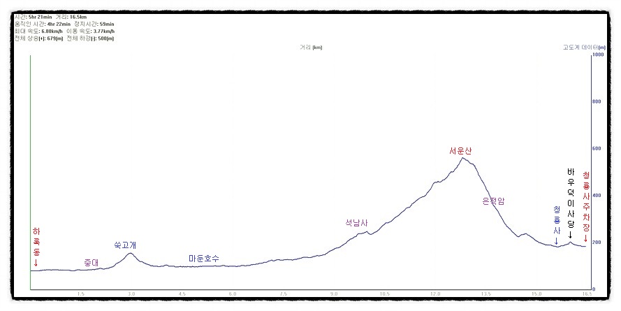 ['고도표'] 오늘 걸은 거리는 16.5km였으며, 5시간 20분이 걸렸습니다. <부록> "금북정맥 두번째구간 산행기"