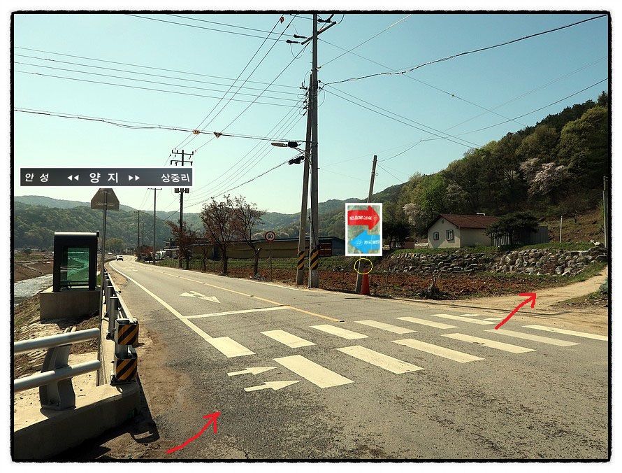 ['양지버스정류장'] 10:39 다리를 건너면 <양지버스정류장>이 있으며 둘레길은 우측 마을길로 안내 됩니다. 물론 <313번지방도로>를 따라 직진하면 거리가 많이 단축됩니다만 위험합니다.