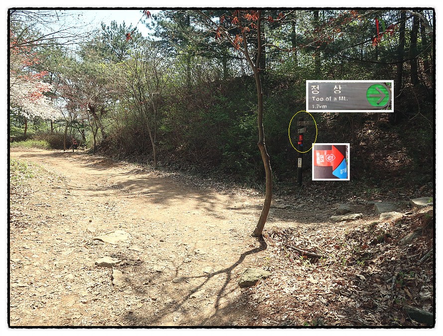 [갈림길] 12:05 삼거리 갈림길을 만나는데 우측으로 안내되며, 정상까지 "1.7km" 남았다고 알려 줍니다.