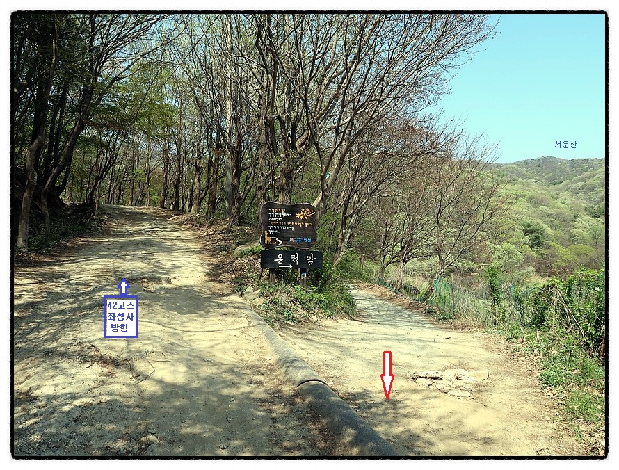 ['서운산 자연휴양림'] 11:17 그러면 "서운산자연휴양림" 갈림길을 만나고, 계속해서 12분 정도 도로를 따라 더 올라 가면...