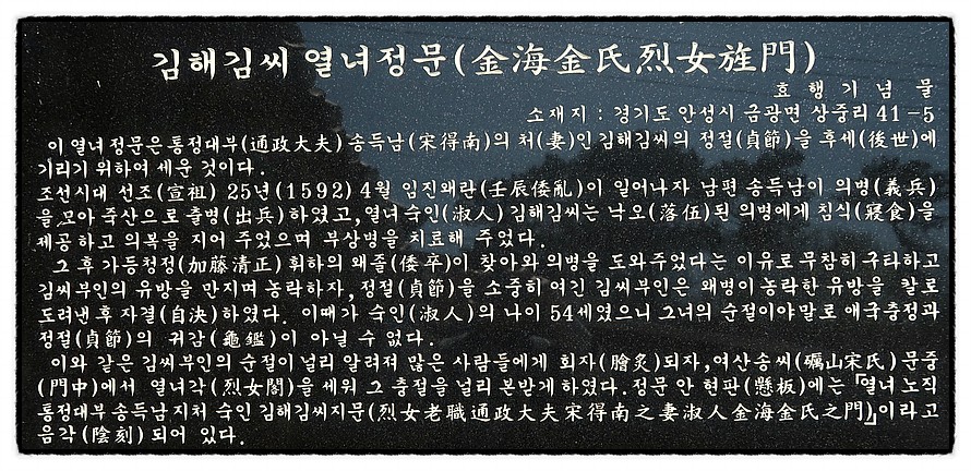 ['열녀정문'] <중촌마을회관> 앞에는 "김해김씨 열녀정문"이 있고