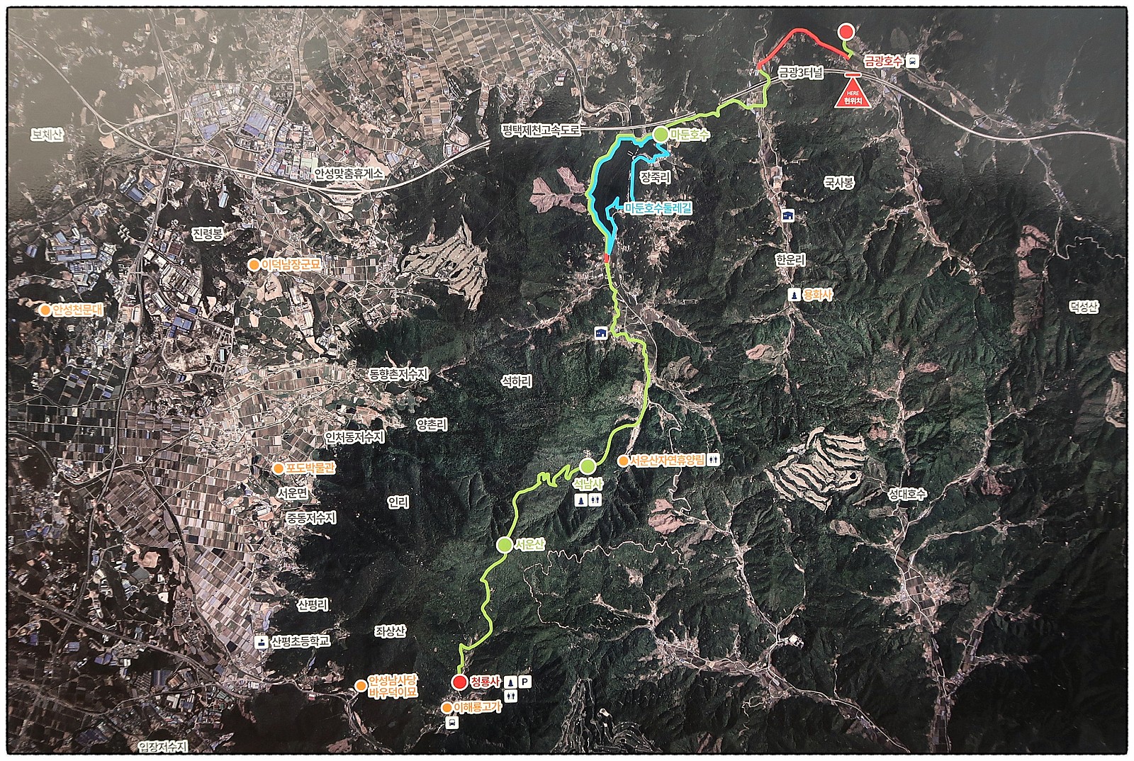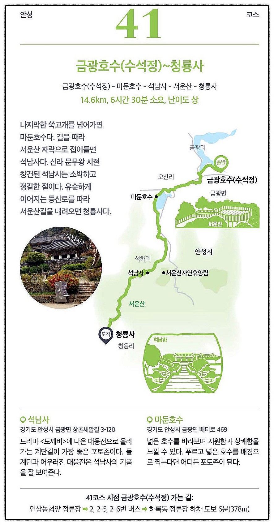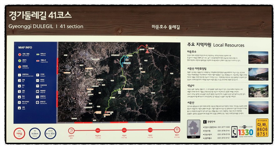 『경기둘레길』 『안성41코스』 마둔호수와 서운산, 청룡사와 그리운 바우덕이 하록동-쑥고개-마둔호수-중촌마을-상촌마을-석남사-서운산-은적암-청룡사-바우덕이사당['안성41코스 안내도']