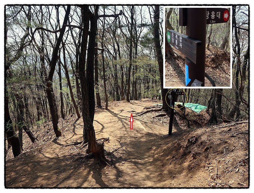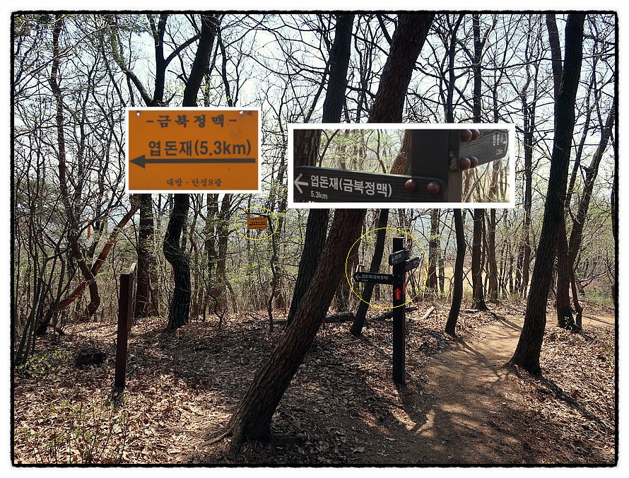 ['금북정맥' 갈림길] 12:58 <금북정맥>과 헤어지는 삼거리를 만납니다. <대방.안성8광님>이 설치한 <금북정맥안내판>은 지금도 있는데, 12년 전에는 노란색이었고 지금은 주황색으로 바뀌었군요. 걸려 있는 위치도 바뀌었는데 새로 설치한듯한데 <대방.안성8광님>은 세월이 흘렀는데도 여전히 건강하신지.... <경기둘레길>은 우측으로 내려 갑니다.