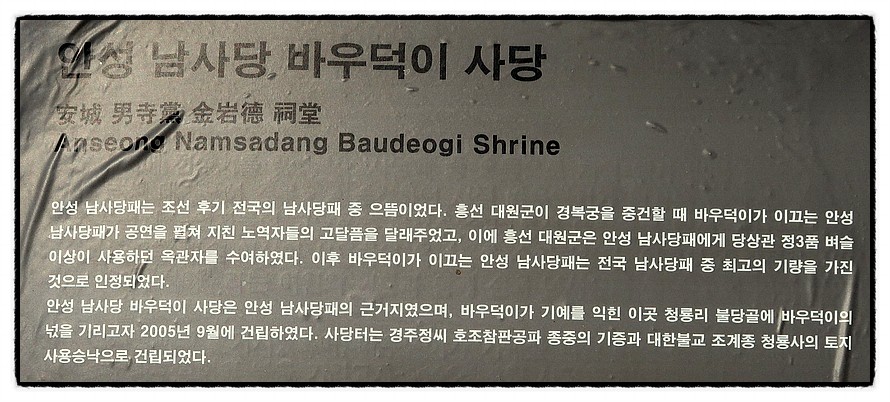 ['바우덕이 사당'] "바우덕이-金岩德 1848~1870" 남존여비의 조선시대에서 여성으로는 우리나라 최초의 남사당패 총대장인 "꼭두쇠"였는데 미모는 말할것도 없고, 노래 춤 기예가 상상할수 없을 정도로 뛰어 난 당대의 최고 예술가여서, <경복궁>을 중수하던 노동자들의 사기진작을 위해 <대원군>의 부름을 받고 <경복궁>에서 공연을 해 <바우덕이>가 이끄는 "안성 남사당패"는 <대원군>으로부터 정3품 이상의 벼슬아치들에게만 하사하는 "옥관자"를 하사 받았으니 천민으로선 엄청난 사회적 이슈였답니다. 요즘말로 하자면 "국가가 실제로 인정한 최고의 국민 아이돌 가수및 예술단"이였답니다. <바우덕이>의 인기는 하늘을 찌를 정도 였다고 하며, 다른 지역에 공연을 나가면 타 지역 남사당패들이 나와 무릎을 꿇고 <정3품 당상관>을 대하는 존경의 절을 했다고 합니다. 우리나라 최초로 여성 대중 인기연예인이 탄생한것이니, <바우덕이>가 요즘에 태어 났다면 아마도 <소녀시대> 정도는 발 아래 깔고 <블랙핑크> 이상의 인기를 누렸을거라 생각 됩니다. 그러나 아쉽게도 그녀는 꽃다운 나이 스무세살에 폐병으로 요절하고 맙니다. 오호 통재라~