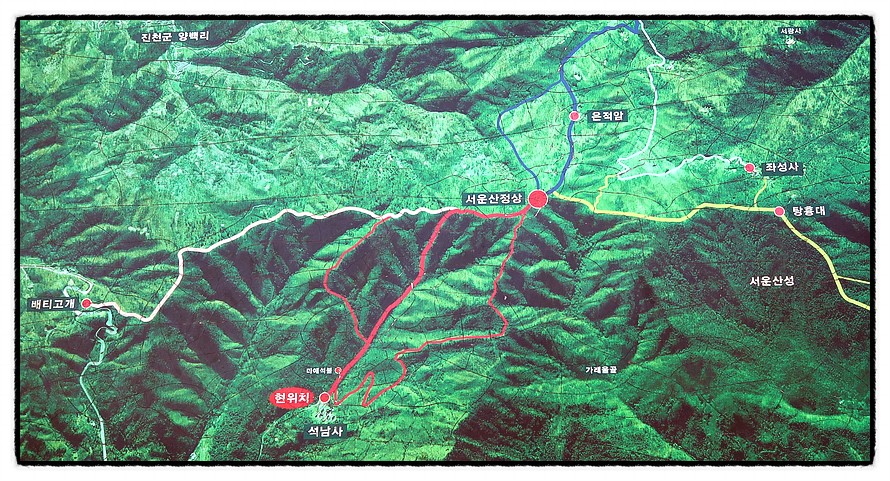 [등산안내도] <서운산 등산로>는 계곡길과 능선길이 있는데, <경기둘레길>은 우측 능선길을 이용하는군요.