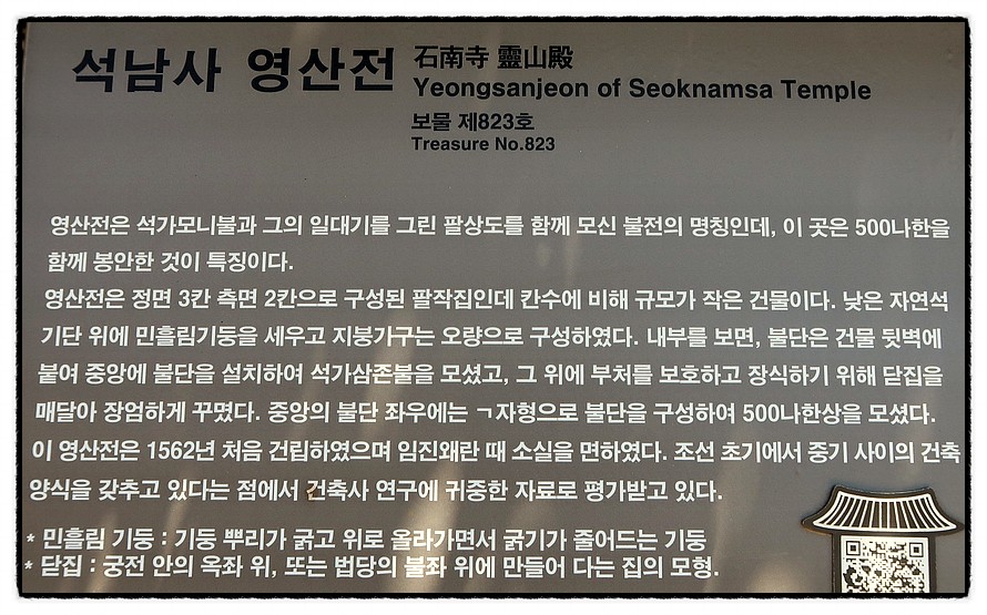 ['영산전'] "영산전 靈山殿 보물 제823호" <석남사>에 있는 보물은 바로 이 <영산전>이라고 하는군요.