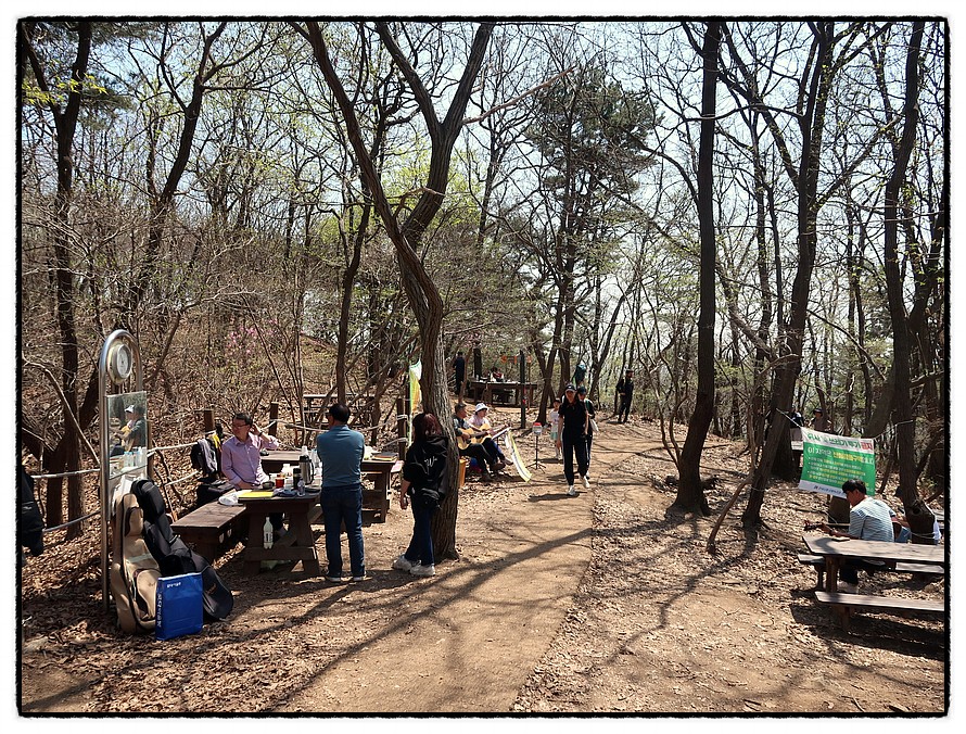 ['서운산 정상 쉼터'] 12:56 정상 쉼터에는 기타를 치며 노래를 부르는 뚜엣도 있는데 가수 지망생인듯.... <안성의 진산>이고 유명한 산이여서 봄날을 맞아 산객들이 많군요.