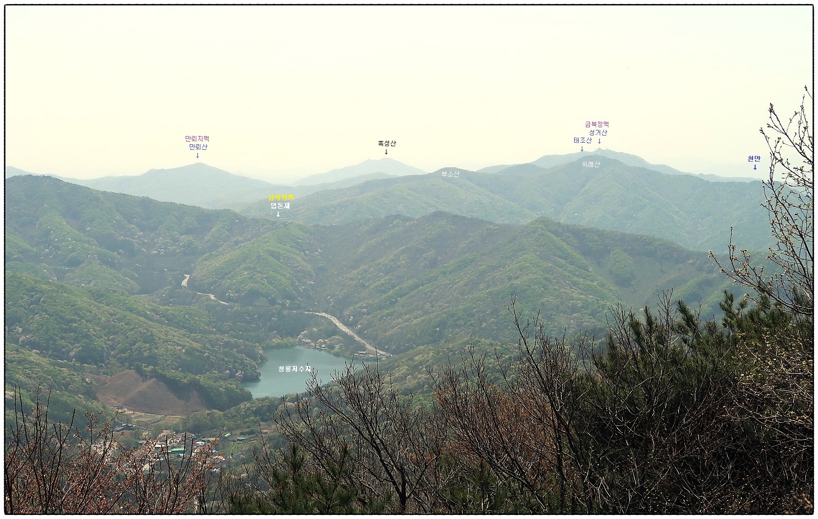['청룡저수지' 조망] ★사진을 클릭하면 확대 됨★ <41코스 종점>인 <청룡저수지>가 조망되며 <금북정맥> 산줄기가 파도를 치며 <태안반도>로 향합니다 이 사진을 클릭하면 확대되며 설명이 첨부되 있으니 꼭 클릭 해 보세요~~