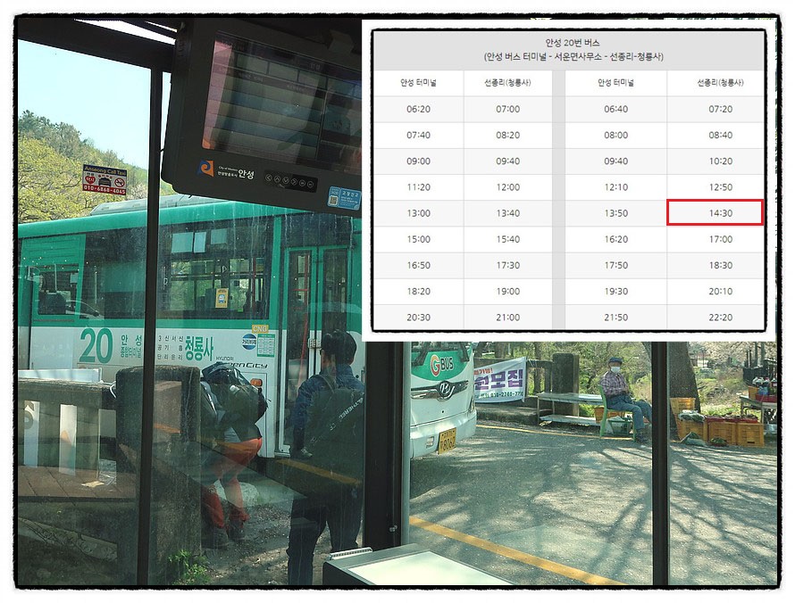 ['청룡사 버스종점'] 2:10~2:30 <청룡사 버스종점>에서 2시30분에 출발하는 <20번 시내버스>를 타고 <안성 시민회관> 앞에서 내려 건너편 버스정류장에서 <8201번 광역버스>를 3시7분경에 환승하여 분당으로 귀가했습니다.