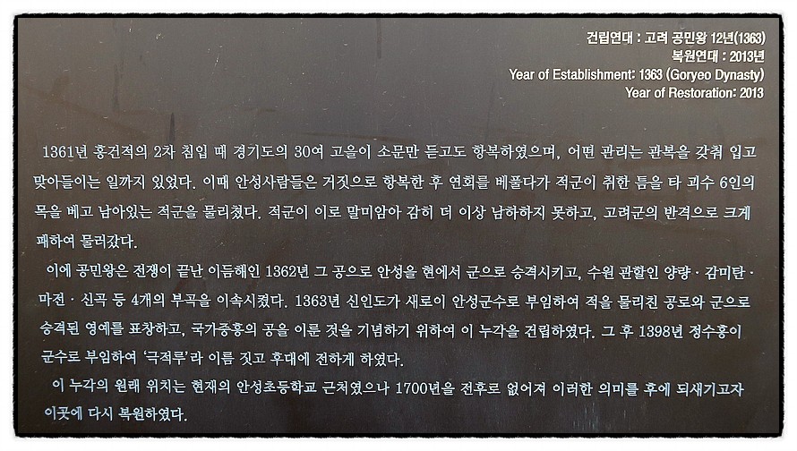 ['극적루'] "극적루 克敵樓" <조령천>이 <안성천>에 합류하는 곳에 <안성의 상징>처럼 우뚝 서 있는 <극적루>입니다. '이길 극克'에 '원수 적敵'을 사용하는 樓는 고려시대 말 "홍건적의 침입"을 막아 낸 것을 기념하기 위해 건립했답니다.