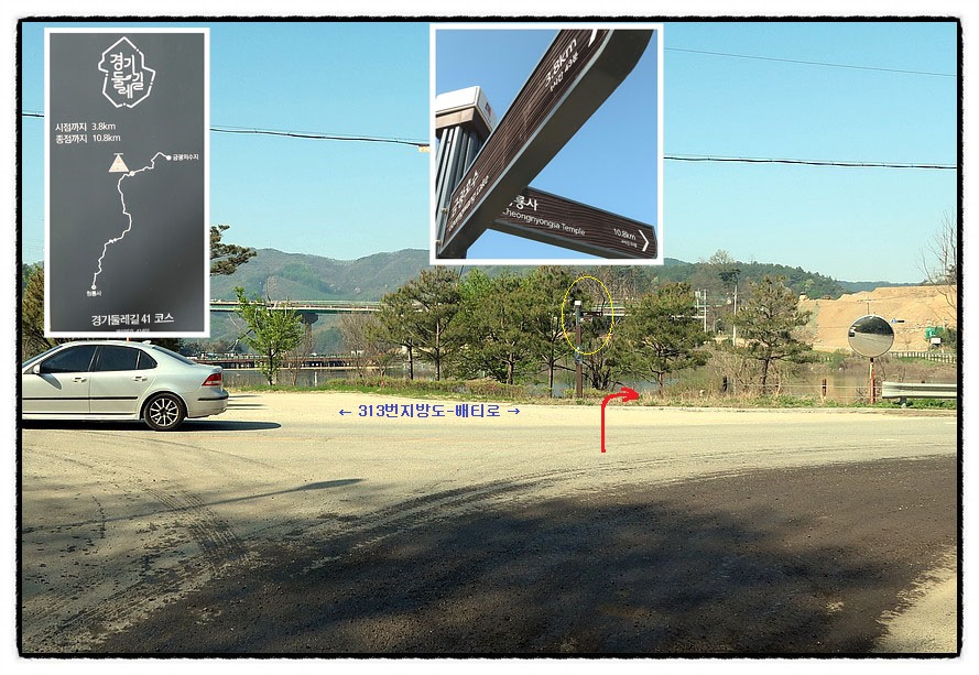['313번지방도 삼거리'] 9:38 <쑥고개>에서 내려가면 <313번지방도>인 <배티로>를 만나는데 둘레길 이정표가 있습니다. 여기서 <313번지방도>를 따라 좌측으로 진행하면 <석남사 입구>로 조금 빨리 갈수 있습니다만 둘레길은 우측 <마둔호수>를 한바퀴 돌아 가라고 안내합니다.